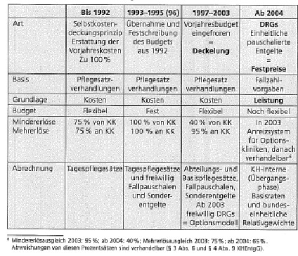 Bundesdeutsche Krankenhausfinanzierung erfolgt über einen pauschalen Teil: Bund, Länder und Gemeinden und über die Krankenversicherung. Der Gesetzgeber hat im Gesundheitswesen in den letzten Jahren starke Veränderungen vorgenommen. Dadurch wird der Anspruch der Kliniken auf eine Vergütung der entstandenen Kosten stärker einem Leistungsbezug unterworfen. Die dazu notwendigen Reformen werden in mehreren Schritten eingeleitet. Zwei herausragende Merkmale sind: